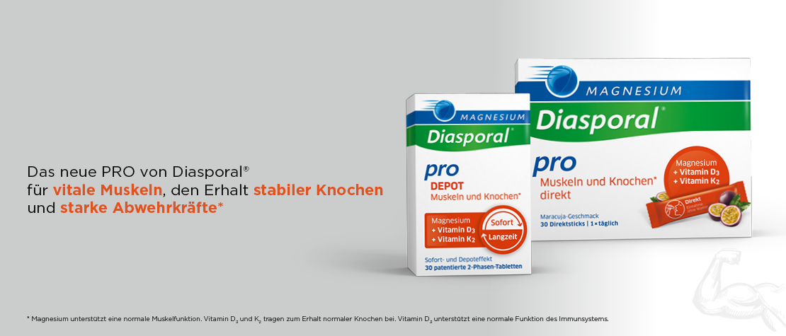 Mikronährstoffe spielen eine wichtige Rolle, wenn es darum geht, einen aktiven Lebensstil zu führen. Nur wenn der Körper konsequent und ausreichend mit Vitaminen und Mineralstoffen versorgt ist, kann er uns beschwingt durchs Leben bewegen. Genau hier setzt Magnesium Diasporal® Pro Muskeln und Knochen direkt an.