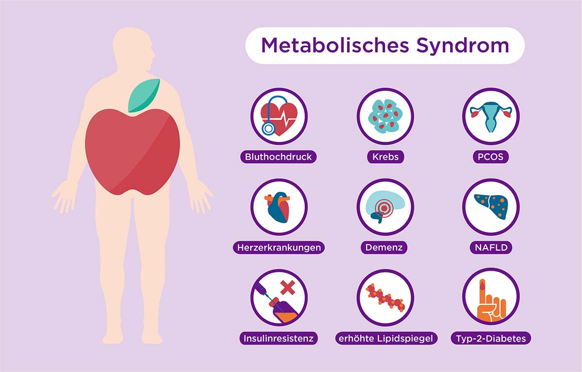 Die Glykogenolyse und Gluconeogenese in der Leber werden angeregt, als Folge steigt der Glucosespiegel im Blut. Insgesamt triggert das viszerale Bauchfett also die Insulinresistenz, Fettstoffwechselstörungen und in der Folge auch Atherosklerose. Damit wird kardiovaskulären Folgeerkrankungen, zum Beispiel dem Koronarsyndrom, Myokardinfarkt und Schlaganfall, der Boden bereitet. Auch bekannt ist, dass das metabolische Syndrom häufig mit einer Fettleber und erhöhten Harnsäurewerten assoziiert ist.