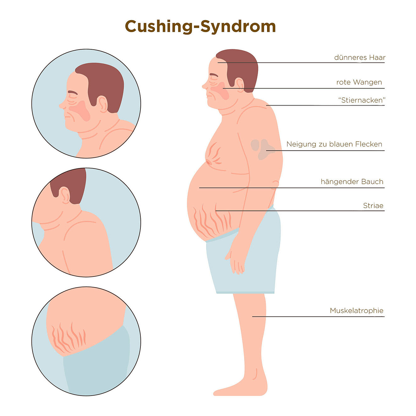 Eine andere Adipositas-begünstigende endokrine Erkrankung ist das Cushing-Syndrom. Ein Überangebot an Glucocorticoiden wie Cortisol führt unter anderem zu einer Gewichtszunahme vor allem am Bauch, einem sogenannten Vollmondgesicht und Steroiddiabetes. Ursachen können zum Beispiel die Langzeiteinnahme von Glucocorticoiden oder Adrenocorticotropem Hormon (ACTH; bei Epilepsie) sein, aber auch Tumoren, die Hormone freisetzen. Beim Morbus Cushing liegt die Ursache im Hypophysenvorderlappen.