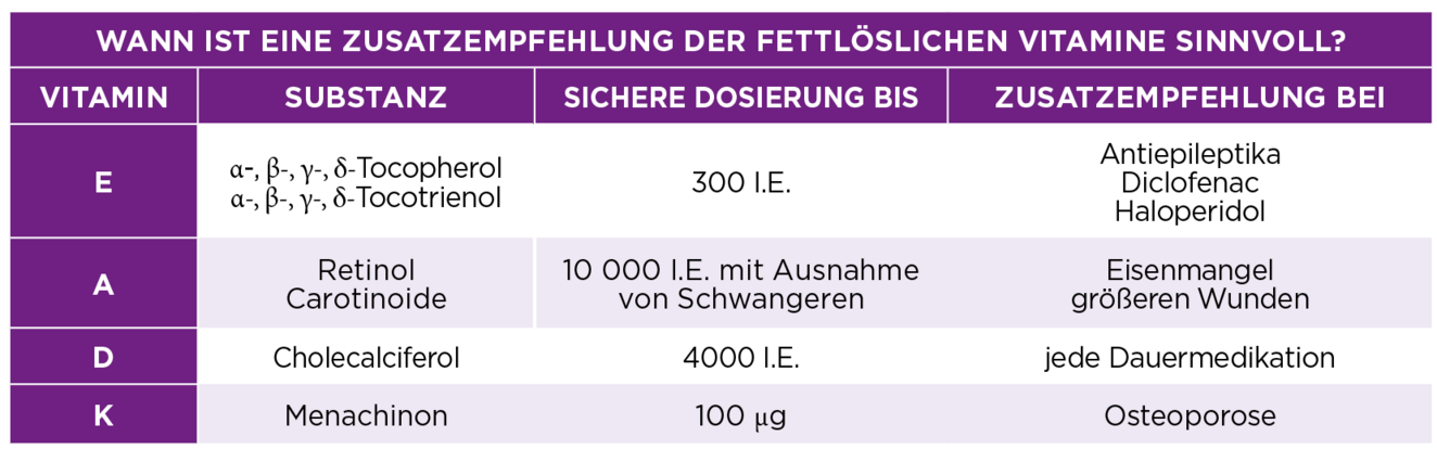 Kunden, die Fettresorptionshemmer einnehmen, haben bei allen fettlöslichen Vitaminen ein erhöhtes Risiko für Mangelerscheinungen. Denn Medikamente wie Orlistat oder Colestyramin unterscheiden nicht zwischen Fetten und Vitaminen. Sie binden diese an sich und schleusen sie wieder aus dem Körper heraus. Nahrungsergänzungsmittel mit fettlöslichen Vitaminen dürfen daher nicht zeitgleich genommen werden.