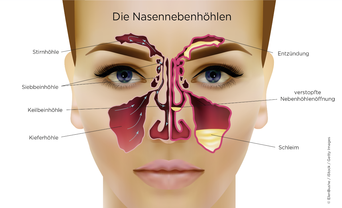 Häufig weitet sich eine viral bedingte Erkältung auf die Nasennebenhöhlen aus. Dann siedeln sich Rhinoviren in den Nasennebenhöhlen an. Auch hier kommt es zum Anschwellen der Schleimhäute und des Bindegewebes, die Belüftung wird beeinträchtigt und Schleim setzt sich in den Gängen fest. Dieser Sekretstau bietet einen optimalen Nährboden für Bakterien. Charakteristisch sind