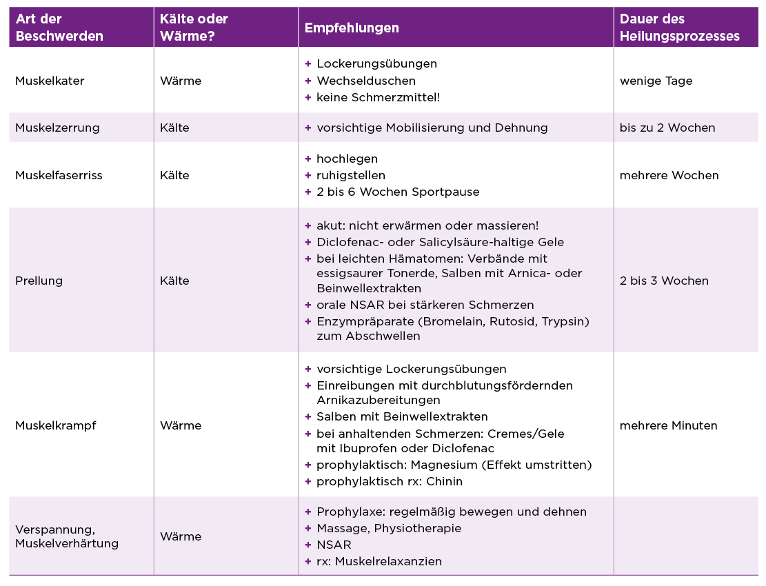Bei unkomplizierten Beschwerden hilft es oft schon, die betroffene Körperregion durch Wärme, Massage oder physiotherapeutische Übungen zu lockern. Die beste Maßnahme zur Vorbeugung ist regelmäßige sportliche Betätigung.