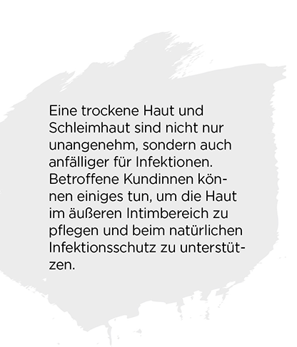 Ich verstehe gut, dass das ihre Lebensqualität beeinträchtigt. Eine trockene Haut oder Schleimhaut im Intimbereich ist nicht nur unangenehm, sondern birgt noch ein anderes Risiko: Frauen werden anfälliger für Infektionen, wie zum Beispiel Blasenentzündungen.