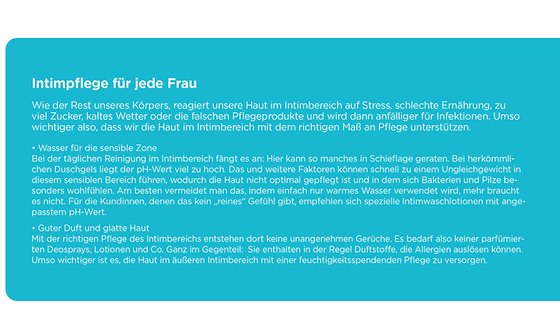 Kundin: Guten Tag, ich habe da ein etwas heikles Thema. Ich bin mitten in den Wechseljahren und habe das Gefühl, dass meine Haut gerade im Intimbereich sehr empfindlich und trocken ist. Und da ich mich bei Ihnen immer gut beraten fühle, wäre ich für einen Tipp sehr dankbar.