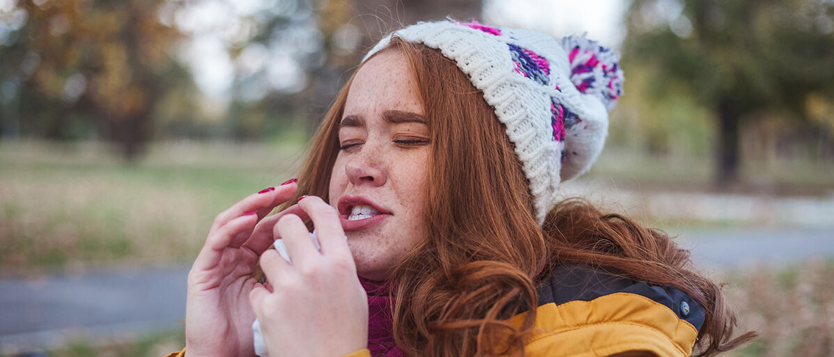 Junge Frau mit gelber Jacke und weißer Wintermuetze niest und haelt sich Haende vors Gesicht© Primorac91 / iStock / Getty Images Plus