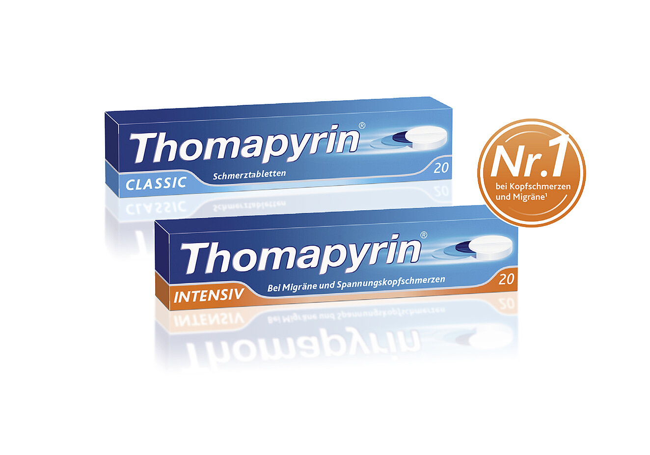 Thomapyrin® CLASSIC Schmerztabletten. Thomapyrin® INTENSIV. Wirkstoff: CLASSIC Schmerztabletten: 1 Tablette enthält 250 mg Acetylsalicylsäure, 200 mg Paracetamol, 50 mg Coffein. Sonst. Bestandt.: Lactose-Monohydrat, Stearinsäure, Maisstärke. Anw.-geb.: Für Erwachsene und Jugendliche ab 12 Jahren bei akuten leichten bis mäßig starken Schmerzen. INTENSIV: 1 Tablette enthält 250 mg Acetylsalicylsäure, 250 mg Paracetamol, 50 mg Coffein. Sonst. Bestandt.: Lactose-Monohydrat, Stearinsäure, Maisstärke. Anw.-geb.: Zur Behandlung von akuten Kopfschmerzen (z. B. Spannungskopfschmerzen) und Migräneanfällen (mit und ohne Aura). Gegenanz.: Überempfindlichkeit gegen Salicylate, NSAIDs oder sonstige Bestandteile; Magen- und Darm-Ulcera; schwere Leber- oder Nierenfunktionsstörungen; schwere, unkontrollierte Herzinsuffizienz; hämorrhagische Diathese; Einnahme von = 15 mg Methotrexat pro Woche; letzten 3 Monate der Schwangerschaft; Kinder bis 12 Jahre. Nebenw.: Häufig: Schwindel, Nervosität, Bauchschmerzen, Mikroblutungen, Sodbrennen, Übelkeit und Erbrechen; Gelegentlich: Durchfall, Palpitationen, Überempfindlichkeitsreaktionen (Haut); Selten: Agitation, Tremor, Tachykardie, Ösophagitis, Hyperhidrose, Erschöpfung, Überempfindlichkeitsreaktionen (z. B. Dyspnoe, Hypotension, anaphylakt. Schock, angioneurotisches Ödem), schwere Hautreaktionen (inkl. Erythema multiforme), gastrointestinale Ulzerationen und Blutungen, Transaminasenerhöhung, Hautrötungen; Sehr selten: Eisenmangelanämie, Hypoglykämie, gastrointestinale Perforation, Leber- oder Nierenfunktionsstörungen, Blutbildveränderungen inkl. Thrombozyto-, Leuko-, Panzytopenie, Agranulozytose, Überempfindlichkeitsreaktionen inkl. Erythem, Urticaria, Bronchospasmus bei NSAID-Allergikern; Häufigkeit nicht bekannt: Blutungen (z. B. Nasen-, Zahnfleisch-, Hautblutung) ggf. verlängerte Blutungszeit (bis 8 Tage nach der Einnahme), Hör-, Sehstörungen, Tinnitus, erosive Gastritis, Verschlechterung infektionsbedingter Entzündungen (mit z. B. nekrotisierender Fasciitis), Schlaflosigkeit. Kopfschmerzen, Somnolenz, geistige Verwirrung können Anzeichen einer Überdosierung sein. Warnhinw.: Schmerzmittel sollen längere Zeit oder in höheren Dosen nicht ohne Befragen des Arztes angewendet werden. Enthält Lactose. Apothekenpflichtig. Sanofi-Aventis Deutschland GmbH, 65926 Frankfurt am Main. Stand: Juni 2017 (SADE.THOM2.17.05.1153)