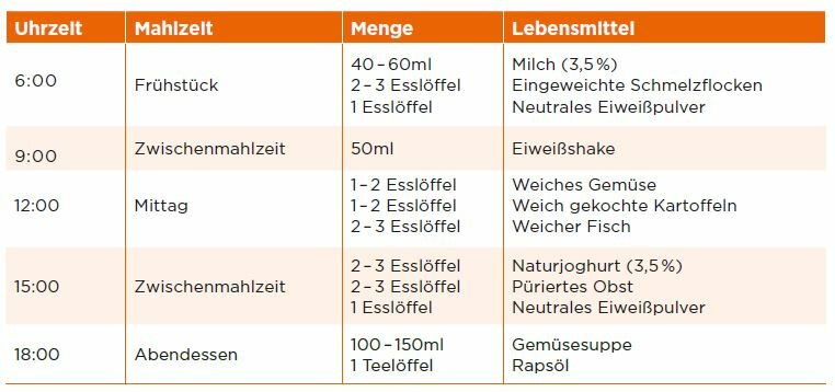 Herr Ludwig begann daher ganz langsam Lebensmittel auszuprobieren und achtete auf die Verträglichkeit. Anfangs aß er pürierte Lebensmittel aus der Gruppe „leichte Vollkost“ wie beispielsweise Möhrenpüree oder Käse-Kartoffel-Püree. Mit der Zeit wurde die Konsistenz fester, dann wählte er Lebensmittel, die er mit der Gabel zerdrücken konnte, wie zum Beispiel weichen Fisch.