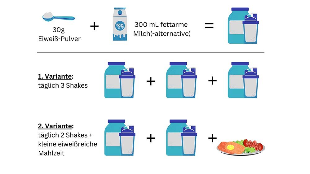 Er hatte die Wahl zwischen drei Eiweißshakes über den Tag verteilt, mit jeweils 30 Gramm (g) Eiweißpulver, eingerührt in 300 Milliliter (ml) fettarme Milch, Hafermilch, Sojamilch oder Wasser oder zwei Eiweißshakes wie und einer eiweißreichen Mahlzeit. Hier konnte er aus konkreten Rezeptideen mit magerem Fleisch, Fisch, Quark oder Tofu und etwas Gemüse auswählen.