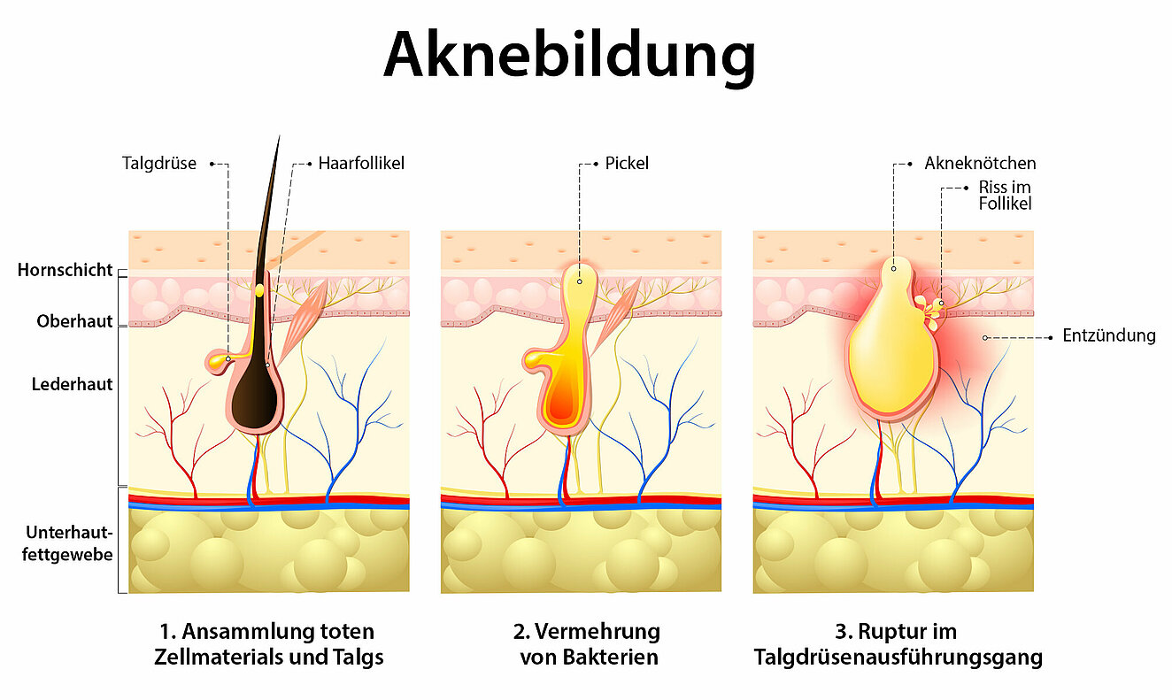Es kommt zu einer Talgdrüsenüberfunktion, häufig zeigt sich die Haut in der Pubertät fettig. Normalerweise gelangt der Talg über den Talgdrüsenkanal mühelos an die Hautoberfläche. Bildet sich am Ausgang einer Talgdrüse jedoch eine Hornschicht, die den Ausführungsgang verstopft, kann das Sebum nicht mehr abfließen.