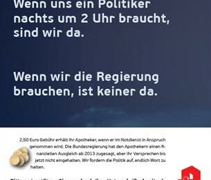 Unter anderem heißt es auf den Plakaten: „Die Bundesregierung hat den Apothekern einen finanziellen Ausgleich ab 2013 zugesagt, aber ihr Versprechen bis jetzt nicht eingehalten. Wir fordern die Politik auf, endlich Wort zu halten.“