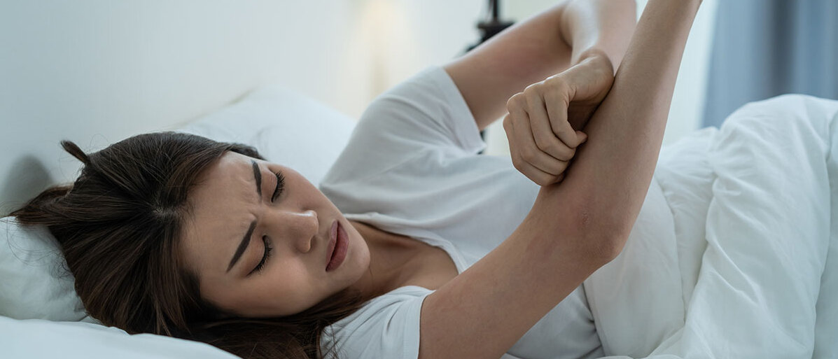 Frau kratzt sich am Unterarm. Sie liegt im Bett.© Kiwis / iStock / Getty Images Plus