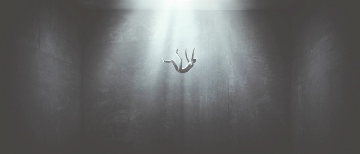 Ein fiktives Bild, auf dem eine Person aus einem hellen Bereich in ein dunkles Loch fällt.