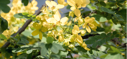 Sennesblätter und Sennesfrüchte An den gestreiften Stängeln der Sträucher stehen wechselständig angeordnet dünne, spröde und wenig behaarte oder kahle hellgrüne Blätter. Sie sind fünf- bis neunpaarig gefiedert. Während die indischen Fiederblättchen eine Länge von bis zu sechs Zentimetern haben, sind die der ägyptischen Ware nur halb so lang. Auf die länglich-lanzettliche Form der Blätter machen die beiden Artennamen aufmerksam (lat. acutifiolia = spitz- blättrig, lat. angustifolia = schmalblättrig). Die Blüten beider Arten sind gelb, blattachselständig und in Trauben ange- ordnet. Aus ihnen entwickeln sich flache, braun- bis grau-grüne bis zu fünf Zentimeter lange und etwa ein Zentimeter breite Hülsenfrüchte. Der oft verwendete Begriff Sennesschoten ist somit botanisch falsch. Die Hülsen sind nierenförmig gebogen und enthalten sieben bis zehn (Cassia angustifolia VAHL.) oder fünf bis sieben Sa- men (Cassia senna L.).