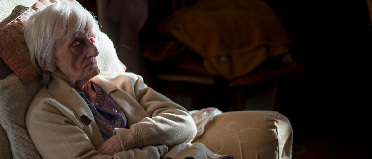 Eine Seniorin sitzt mit überkreuzten Armen und bitterem Gesichtsausdruck in einem abgedunkelten Zimmer im Sessel.© Neil Bussey / iStock / Getty Images Plus