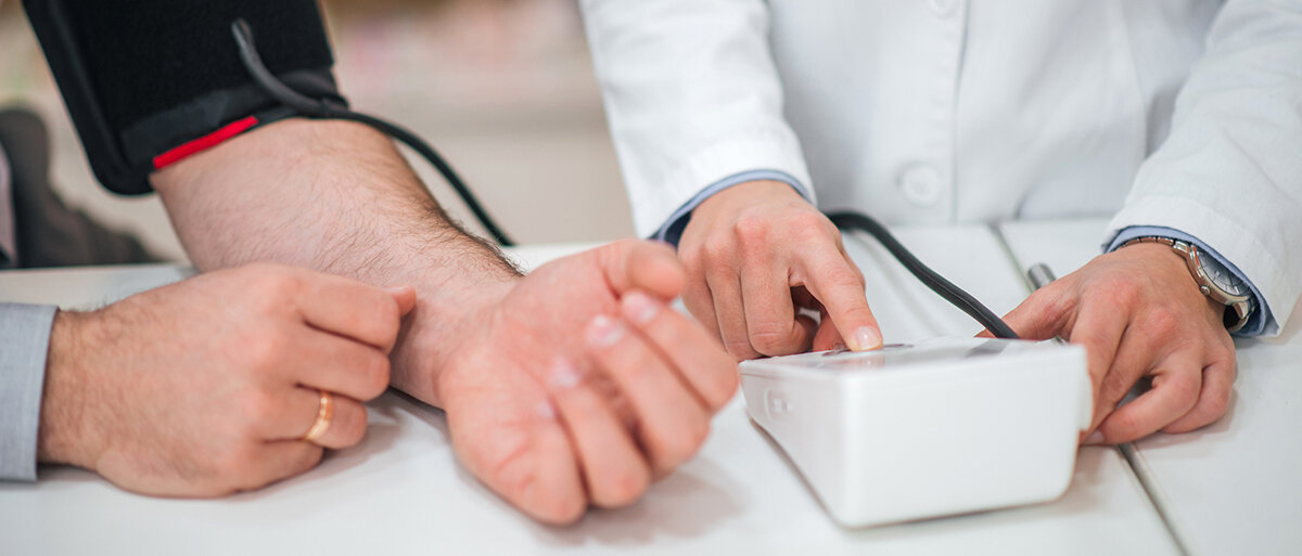 Nahaufnahme einer Blutdruckmessung in der Apotheke© nortonrsx / iStock / Getty Images Plus