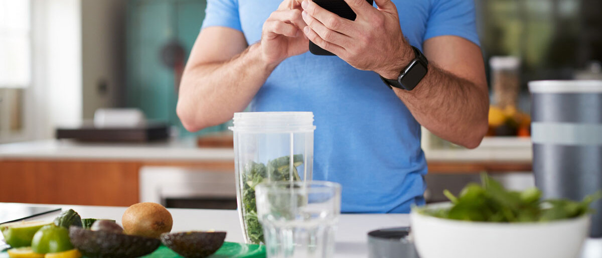 Ein Mann steht neben einem Schneidebrett voller Obst und Gemüse. Er hält ein Smartphone in der Hand.