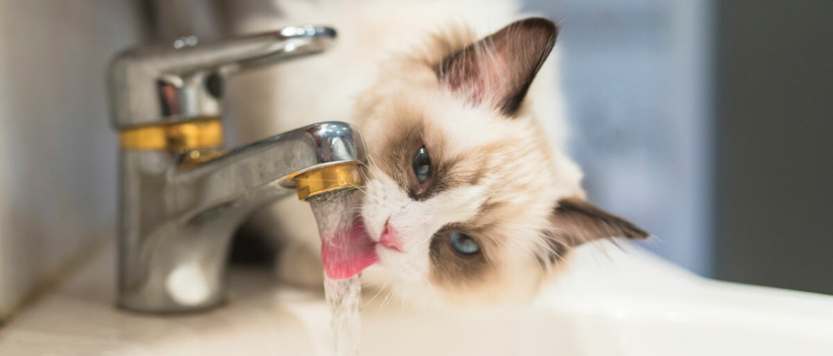 Eine Katze sitzt auf dem Waschbecken, hält den Kopf unter den laufenden Wasserhahn und trinkt.© Angela Kotsell / iStock / Getty Images Plus