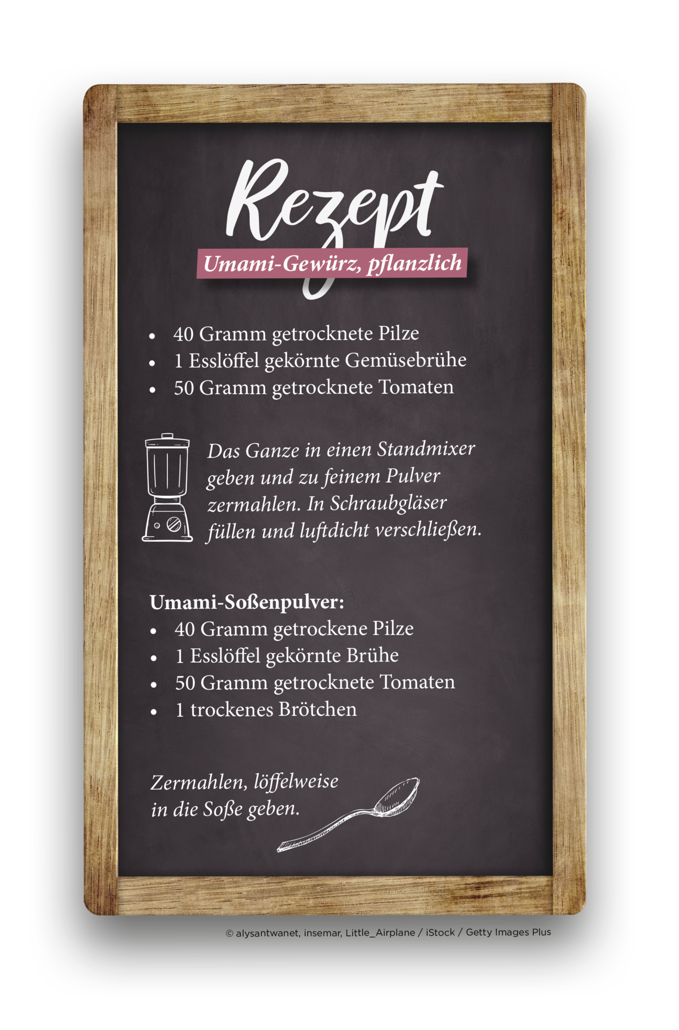 Bisher war man davon ausgegangen, dass der Mensch nur süß, sauer, salzig und bitter auf seiner Zunge erspüren konnte, doch nun änderte sich alles. Ohne in komplizierte chemische Strukturformeln zu verfallen, sei hier nur das eine gesagt: Evolutionär hatte sich eine Art übergreifender Geschmackssinn herausgebildet, den man am ehesten mit lecker, fleischig, herzhaft oder vollmundig beschreiben kann. Dabei reagieren die Rezeptoren auf das Salz der Glutaminsäure, das in manchen Lebensmitteln enthalten ist – und uns läuft der Sabber. Schmecken wir es, weiß der Körper nämlich, dass er proteinreiche Nahrung erwarten darf, also dasjenige wertvolle Eiweiß, das er zur Aufrechterhaltung lebenswichtiger Funktionen dringend benötigt.