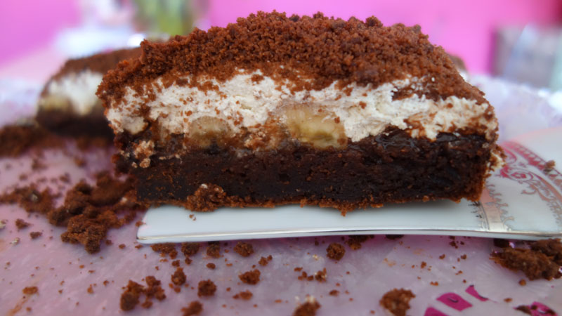 Die Bananen längs halbieren, von allen Seiten mit Zitronensaft beträufeln, damit sie nicht so schnell braun werden. Auf dem Kuchenboden verteilen. Dann die Sahnecreme kuppelartig auf dem Boden mit den Bananen verteilen. Mit einem breiten Teigschaber oder einem Teigspatel glattstreichen. Zum Abschluss die Kuchenbrösel gleichmäßig darauf verteilen und leicht andrücken.