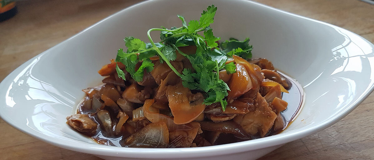 Die Gemüsezwiebeln schälen, kalt waschen, halbieren und in mitteldicke Stücke schneiden. Champignons kalt waschen, in Scheiben oder Viertel schneiden. Knoblauch abziehen und fein hacken oder pressen.
