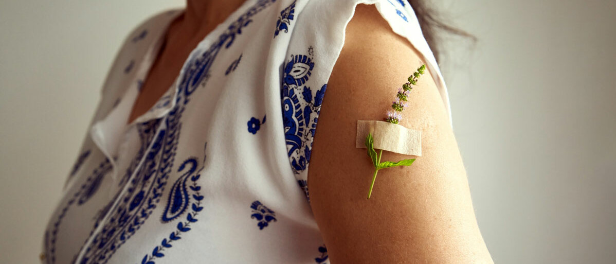 Eine Frau zeigt ihren Oberarm mit Pflaster. Unter dem Pflaster klemmt eine Blüte.© Madeleine_Steinbach / iStock / Getty Images Plus