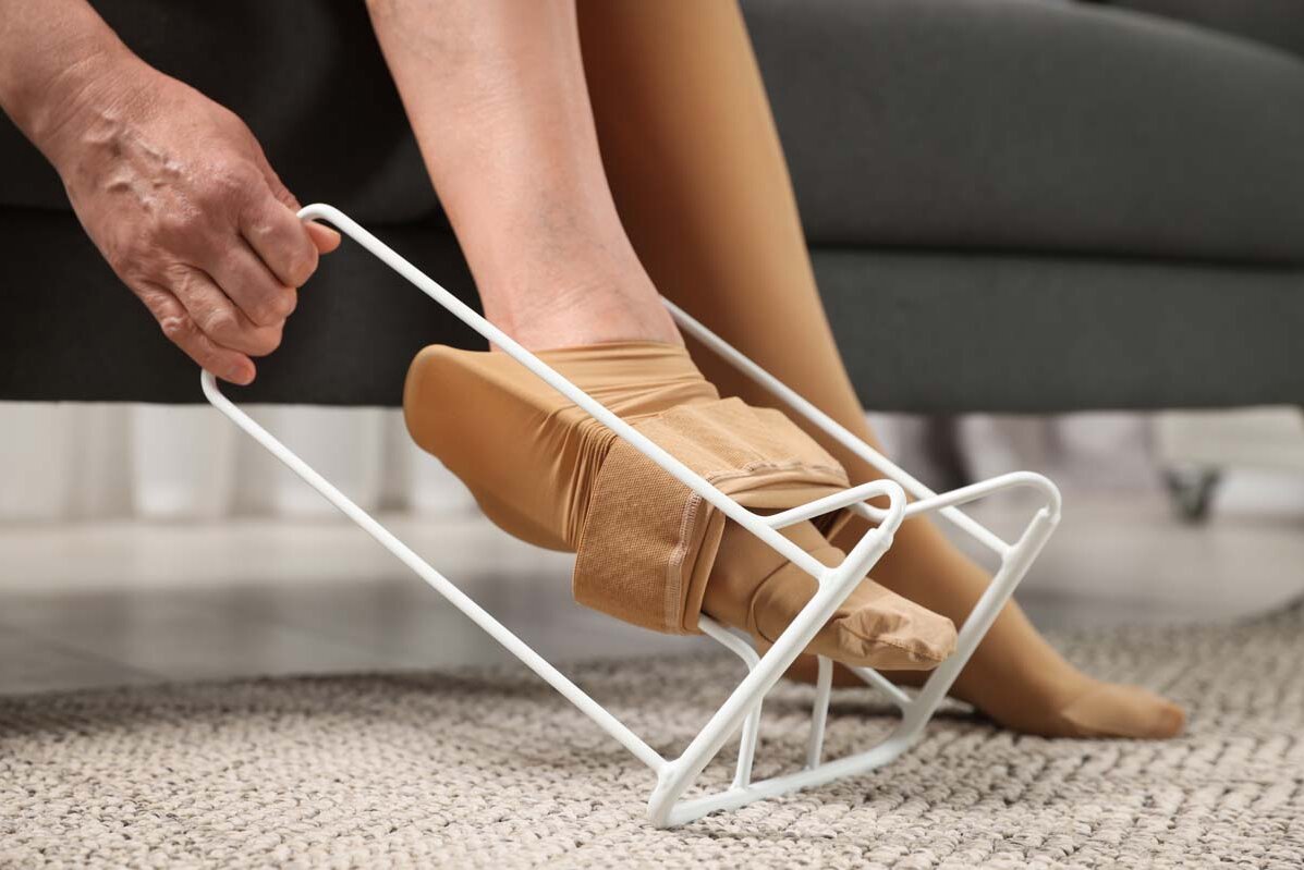 Es gibt verschiedene Möglichkeiten, Venenleiden zu behandeln. Die Verwendung von medizinischen Kompressionsstrümpfen stellt bei allen Patient*innen die Basistherapie dar. Am häufigsten werden Kompressionsstrümpfe eingesetzt, sie können bereits bei Stauungsgefühlen sowie bei schweren und geschwollenen Beinen getragen werden. Sie entlasten das geschädigte Venen- und Lymphsystem, indem sie von außen Druck auf das Beingewebe ausüben. Dadurch verhindern sie, dass sich Wasser im Gewebe ansammelt. Zugleich schließen die Venenklappen durch den verengten Venendurchmesser wieder besser. Das Blut kann dadurch besser in Richtung Herz abfließen.