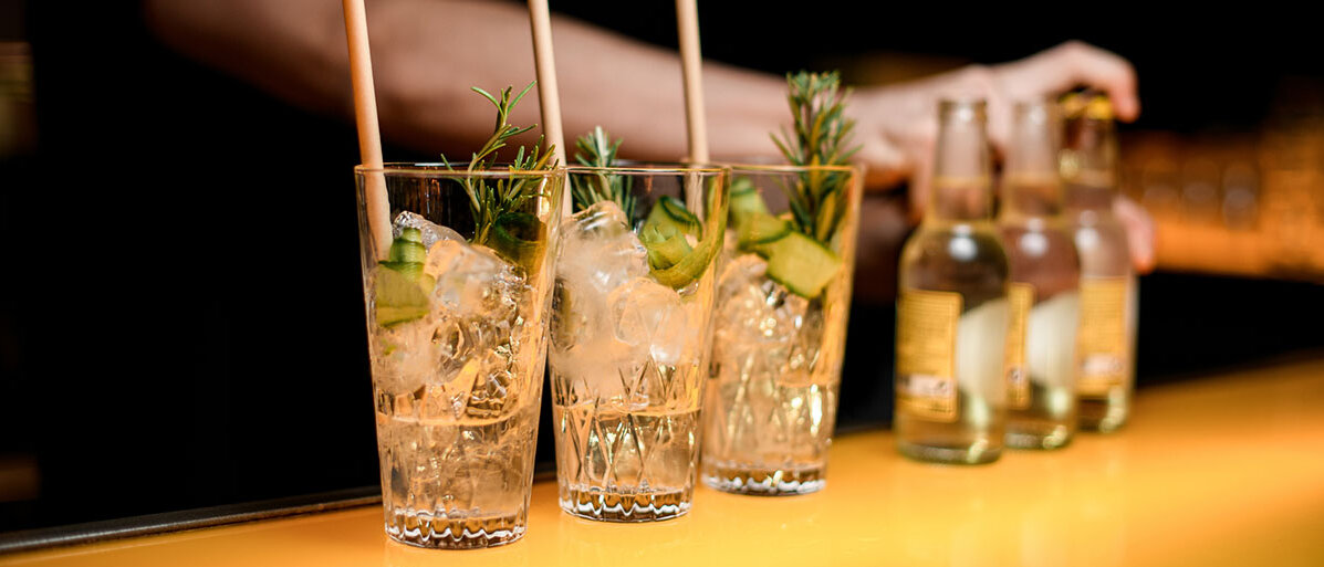 Auf einer Bar stehen drei Longdrink-Gläser mit Gin, Eis, Gurke und Rosmarin. Der Barkeeper öffnet gerade drei Fläschchen Tonic Water, die daneben stehen.© MaximFesenko/iStock/Getty Images Plus