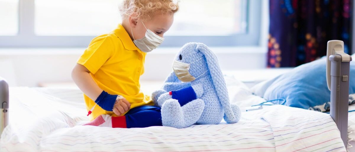 Ein Kind sitzt mit seinem Stoffhasen im Bett eines Krankenhauses und trägt einen Mundschutz.