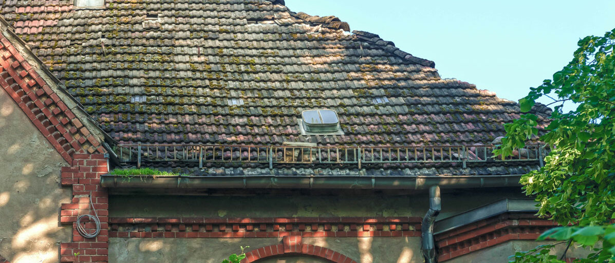 Ein altes Haus hat ein Dach mit losen Schindeln und Löchern.© Lichtwolke / iStock / Getty Images Plus