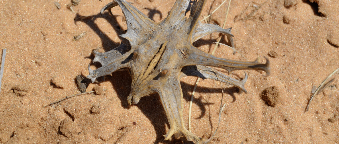 Aus eiförmigen Samenkapseln bilden sich korallenähnliche Gebilde mit armartigen Aus- wüchsen, die mit langen Widerhaken versehen sind. Diese verhaken sich im Fell oder in den Hufen vorbeiziehender Tiere, wodurch sich die Steppenpflanze verbreitet. Da sie gleichzeitig zu gefährlichen Verletzungen führt, trägt Harpagophytum procumbens DC. im Deutschen den Namen Teufelskralle. Bekannte Synonyme sind zudem Trampelklette oder Devil’s Claw.