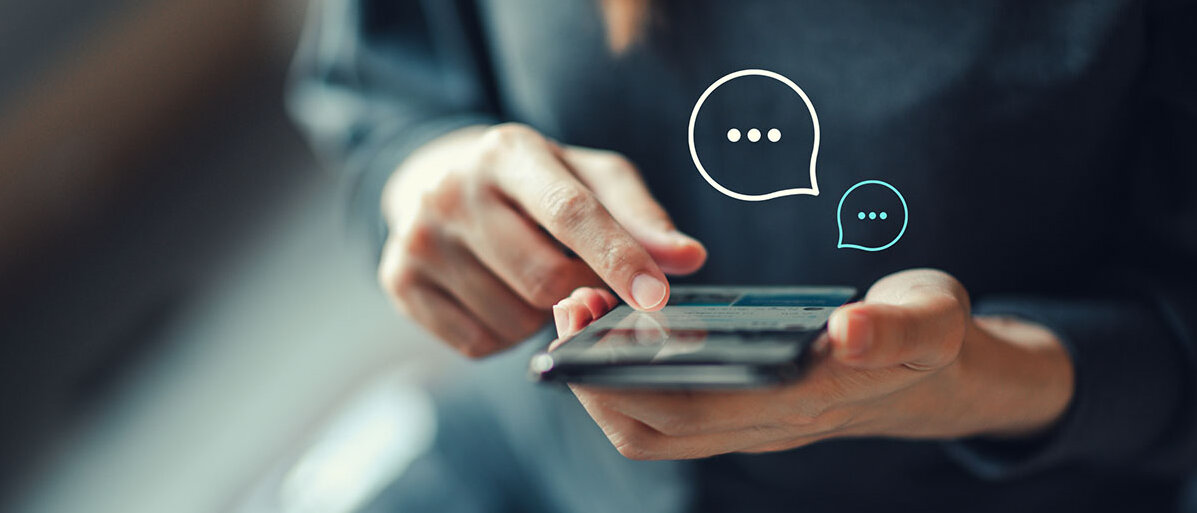 Eine Frau tippt auf ihrem Smartphone. Darüber sind zwei Sprechblasen illustriert.© oatawa / iStock / Getty Images Plus