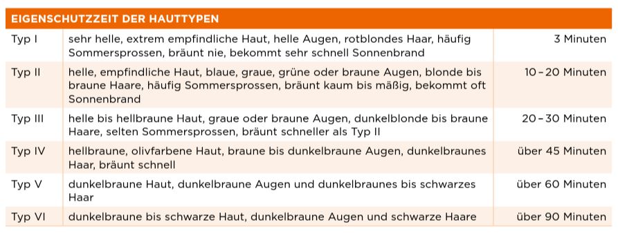 Hauttypen Der US-amerikanische Dermatologe Thomas Fitzpatrick unterschied 1975 sechs verschiedene Hauttypen, die wir noch heute nutzen. Die Typen unterscheiden sich darin, wie hell Haut, Haare und Augen sind, wie schnell jemand bräunt und ob die Person Sommersprossen hat. Je nach Hauttyp kann man sich eine gewisse Zeit in der Sonne aufhalten, ohne einen Sonnenbrand zu bekommen. Standardisiert auf einen UV-Index von 8 wird dieser Wert als Eigenschutzzeit angegeben (s. Tabelle).