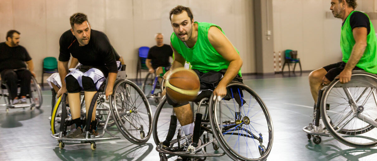 Eine Gruppe Rollstuhl-Basketballer spielen