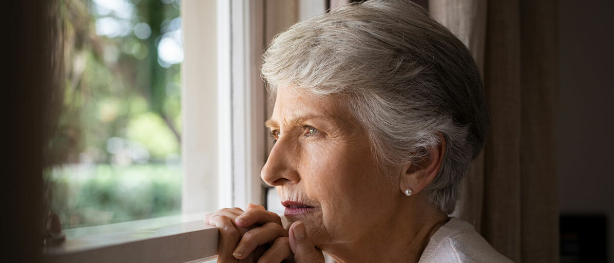 Ältere Frau steht am Fenster und schaut traurig© Ridofranz / iStock / Getty Images Plus
