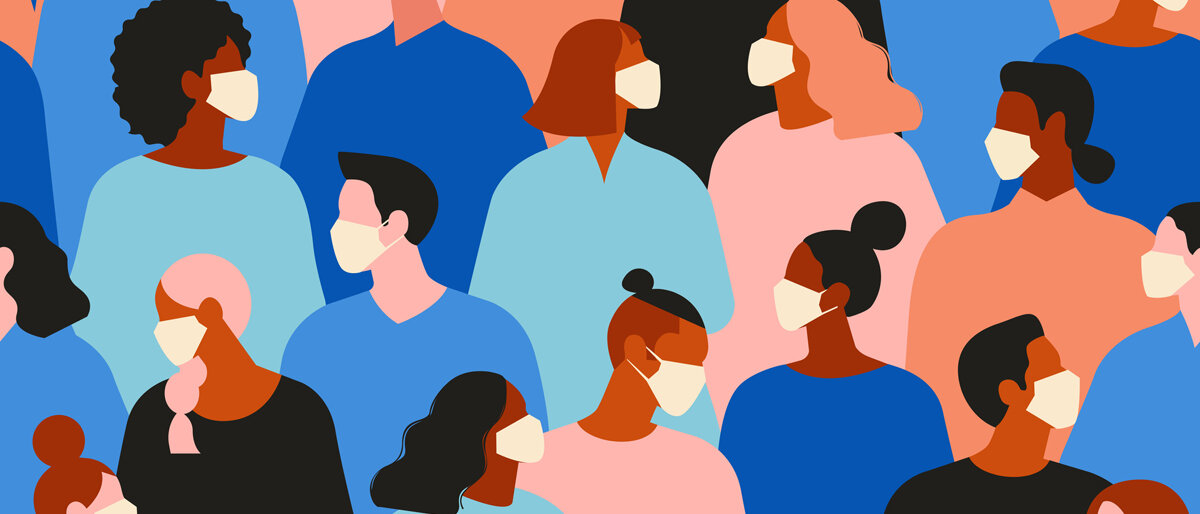 Eine Grafik zeigt viele Menschen, die nah beieinander stehen und Mund-Nasen-Masken tragen.