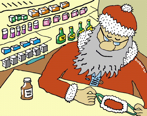Gerade, als sie sich umwenden wollte, um ins Büro zu gehen, trat jemand ans Notdienstfenster. Eine große, massive Gestalt in irgendeinem Karnevalskostüm. Britta trat näher, öffnete die Klappe - und hielt inne. Vor ihr stand der Weihnachtsmann. Sie war so überrascht, dass es ihr einen Augenblick die Sprache verschlug. Dann lächelte sie. „N’Abend“, nuschelte der Mann. „Ich brauch…“ – er grub in den Taschen seines roten Umhangs – „Wo isses denn? Ach ja, hier!“ Und er schob ihr ein blaues Rezept zu. Britta griff danach und las „Myrrhentinktur“. Sie schüttelte innerlich den Kopf. Wegen sowas schickte der Notdienst einen alten Mann in die Apotheke? „Haben Sie das da?“ fragte die Gestalt. Britta überlegte. „Lassen Sie mich bitte kurz nachschauen, ich bin gleich wieder bei Ihnen.“