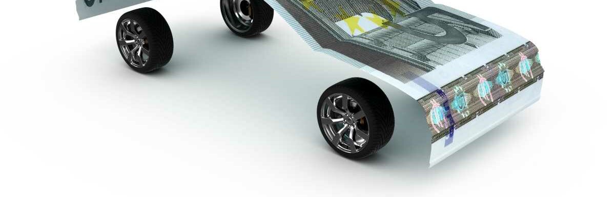 Reifen und ein gebogener 5 Euro-Schein deuten ein Auto an.