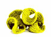 Lebendiger werden die Häkelkorallen, wenn Sie unterschiedliche Garne verwenden: Wolle, Seide, Baumwolle, Sojagarn, handgesponnene oder merzerisierte Baumwolle, mit Polyacryl, synthetischem Garn und mit vielen anderen Fasern. Auch feiner Draht funktioniert, strapaziert allerdings die Hände. Testen Sie auch Plastikgarne jeglicher Art aus. Gibt’s im Fachgeschäft. Umweltfreundlich ist „Plarn“, Garn aus zerschnittenen gebrauchten Plastiktüten. Je vielfältiger die Materialpalette, desto besser!