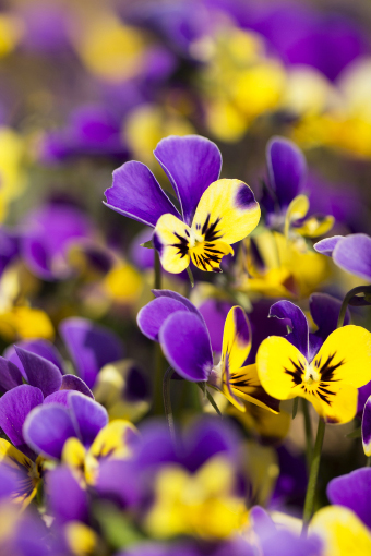 Zwischen Mai bis August erscheinen etwa zwei cm große Blüten, die bei Viola triciolor, wie es der Name schon sagt, aus drei Farben zusammengesetzt sind – violett, gelb und weiß. Ihr deutscher Name geht auf die fünf Blütenblätter zurück, die eine zygomorphe, also eine aus zwei spiegelgleichen Hälften bestehende Blüte bilden. Die zwei oberen Blätter (die Stieftöchter) sind einfarbig, darunter die beiden ebenso, aber mit strahligen dunklen Malen (die leiblichen Töchter). Auch ist das unterste große Blatt strahlenartig gekennzeichnet (die Stiefmutter).
