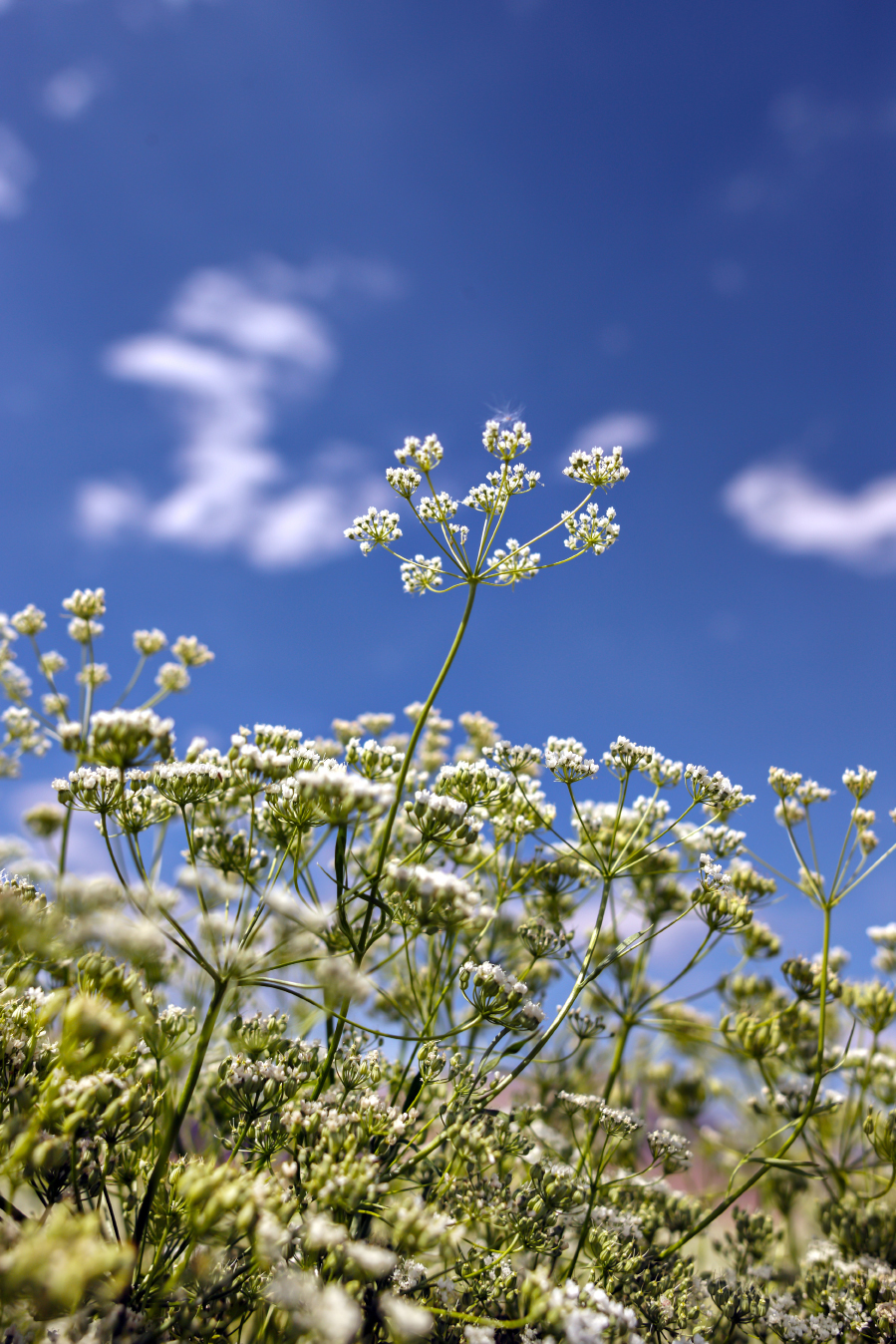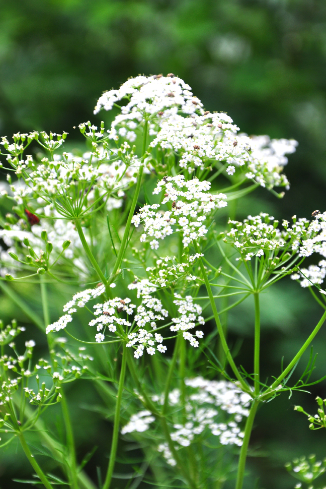 Kümmel Carum carvi L. ist in den gemäßigten Zonen Europas und Asiens beheimatet und wächst bei uns wild auf frischen Fettwiesen, auf Weiden und an Wegrändern. Daher stammen auch die volkstümlichen Namen Feld- oder Wiesenkümmel. Die Apothekenware stammt aber aus Kulturen. Arzneilich werden die Früchte (Carvi fructus) und das daraus hergestellte Kümmelöl (Carvi aetheroleum) genutzt. Der zweijährige Doldenblütler wird bis zu 80 Zentimeter hoch. Im ersten Jahr treibt aus einer möhrenartigen Wurzel zunächst eine Blattrosette. Im zweiten Jahr erhebt sich daraus ein kantig gefurchter Stängel, der sich nach oben hin verästelt.