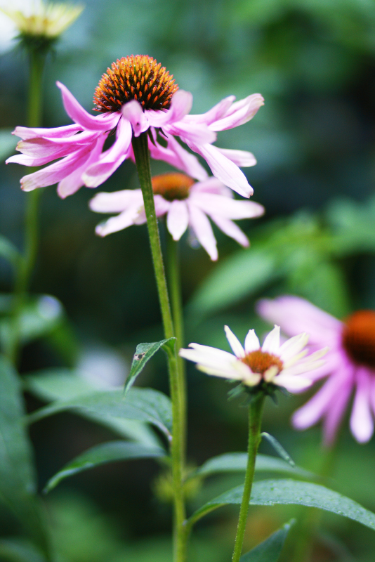 E. purpurea ist mit 180 cm die größte Art und besitzt breite, eiförmige und fünfnervige Blätter. Auffallend sind die purpurfarbenen, hängenden Zungenblüten an den einzeln stehenden stachelig geformten Blütenköpfchen. Bei der Arzneimittelherstellung kommen nicht nur verschiedene Echinacea-Arten, sondern auch unterschiedliche Pflanzenteile zum Einsatz. Während von E. purpurea sowohl die oberirdischen (vorzugsweise der Saft des frischen Krauts) als auch die getrockneten unterirdischen Teile (Wurzeln) arzneiliche Verwendung finden, werden von E. angustifolia und E. pallida nur die getrockneten Wurzeln gebraucht.