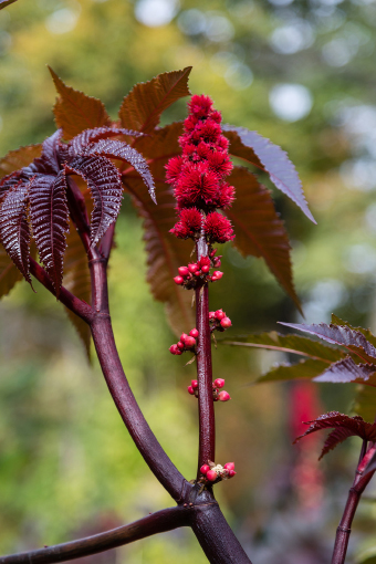 Imposante Rispe Die Rizinuspflanze (Ricinus communis L.) gehört zur Familie der Wolfsmilchgewächse (Euphorbiaceae) und ist ursprünglich in den Subtropen und Tropen beheimatet. Sie wird in Mitteleuropa aufgrund ihrer auffälligen Blätter und Blüten gern als Zier- und Kübelpflanze gehalten. Die Pflanze hat einen dicken rotbraun gefärbten, oft blau bereiften stark verzweigten Stängel, an dem wechselständig große handförmig geteilte, langstielige Blätter sitzen, die einen Durchmesser von bis zu einem Meter erreichen können.