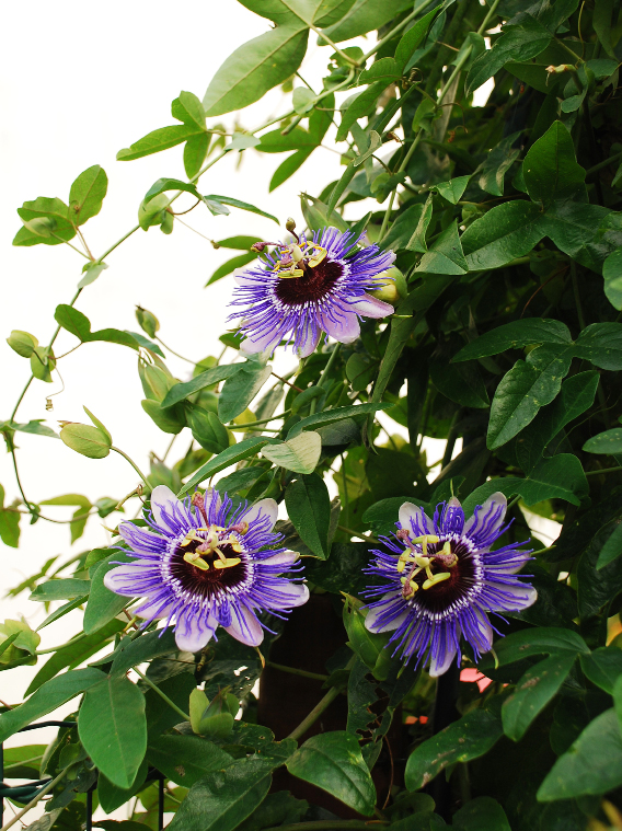 Symbolträchtige Blüte Die ursprünglich aus den tropischen Regenwäldern Mittel- und Südamerikas stammende Passionsblume (Passiflora incarnata L.) aus der Familie der Passionsblumengewächse (Passifloraceae) ist eine immergrüne ausdauernde Kletterpflanze mit eindrucksvollen Blüten. Die bis zu neun Zentimeter (cm) großen weißvioletten Blüten fallen durch ihren besonderen Blütenaufbau auf.