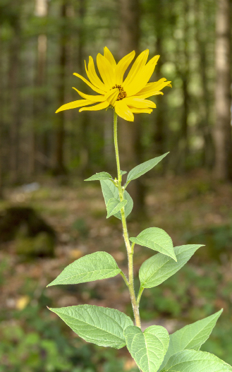 Sie kann sich ähnlich wie andere neueingebürgerte Pflanzen (Neophyten) stark ausdehnen und heimische Pflanzen verdrängen. Mit Wuchshöhen von bis zu vier Metern ist Topinambur sehr imposant. Ebenso auffällig sind die etwa handtellergroßen, eiförmig-lanzettlichen Blätter, die an den aufrechten, verzweigten Stängeln sitzen. Sie sind ebenso wie die Stängel rau und behaart. Helianthus tuberosus L. vermehrt sich vegetativ mit ihren Wurzelknollen, die sich im Juli und August an den unterirdischen Ausläufern bilden. Auf die Wurzelknollen macht auch der lateinische Artname tuberosus aufmerksam, der knollig bedeutet.