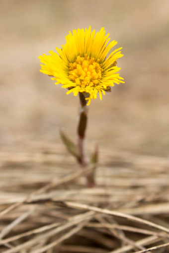 Alte Schleimdroge Bereits zwischen Februar und April kündigen die leuchtend gelben Blütenköpfchen des Huflattichs (Tussilago farfara L.) die warme Jahreszeit an. Der Frühblüher aus der Familie der Korbblütler lockt mit seinem Honigduft Bienen und andere Insekten herbei, für die Tussilago farfara L. zu den ersten Nahrungsquellen im Jahr zählt. Landwirte sind häufig nicht so von der genügsamen Pflanze begeistert, da sie mit ihrem waagerecht wachsenden Wurzelstock große Ackerflächen durchzieht, wodurch sie zu einem kaum zu bekämpfenden Unkraut wird. Die Blütenköpfchen des Huflattichs sind größer als die der Arnika und sitzen einzeln auf den zur Blütezeit mit grünen bis rötlichen Schuppenblättern bedeckten Stielen. Aus der Blüte entwickeln sich mit einer Haarkrone (Pappus) versehene Früchte (Achänen), die an die Pusteblumen des Löwenzahns erinnern.