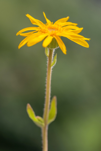 Klassisches WundmittelAls Korbblütler weist Arnika (Arnika montana L.) die für die Familie der Asteraceae typischen aus Röhren- und Zungenblüten zusammengesetzten Blütenkörbchen auf. Die dottergelben Blüten erscheinen von Juni bis August und stehen einzeln oder zu mehreren am Ende des kreuzgegenständig beblätterten, behaarten Blütenstängels. Dieser erhebt sich bis zu 60 Zentimeter (cm) hoch aus einer vier- bis sechsblättrigen flach am Boden wachsenden Rosette. Einst wuchs die krautige Pflanze überwiegend auf sonnigen Bergwiesen alpiner Regionen. Darauf verweist sowohl die Artbezeichnung montana (lat. montanus = Bergbewohner) als auch der volkstümliche Name Bergwohlverleih. Inzwischen ist die in Deutschland unter Naturschutz stehende Heilpflanze in freier Natur nur noch selten anzutreffen.