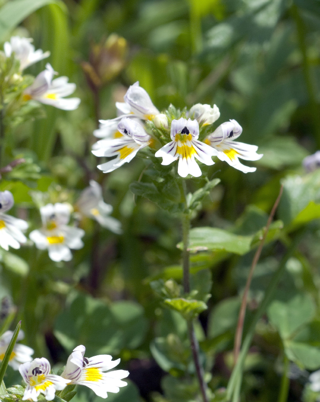 Eine Freude für die AugenDer Gemeine Augentrost (Artenkomplex Euphrasia officinalis) ist auf den ersten Blick eine eher unscheinbare kleine Pflanze, deren Höhe zwischen zwei und 30 Zentimetern variiert. Ihre Stängel sind aufrecht, weich und drüsig behaart. Sie tragen scharf gesägte Laubblätter von länglich-ovaler Form, die im unteren Teil wechselständig und oben gegenständig angeordnet sind. Der einjährige Augentrost aus der Familie der Sommerwurzgewächse (Orobanchaceae) wächst auf mageren, ungedüngten, trockenen Wiesen und Weiden bis in Höhen von über 2000 Metern. Als Halbschmarotzer besitzt er Saugfüße, über die er mit den Wurzeln seiner Wirtspflanze verbunden ist und sich darüber mit Wasser und Mineralstoffen versorgt.