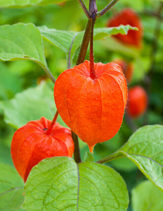 Lampionblume Bei Physalis alkekengi leuchten orange Blütenkelche, welche die Früchte der heimischen Physalis-Art komplett umschließen. Die Lampionblume ist ein ausdauernd-krautiges Nachtschattengewächs (Solanaceae), das in Mittel- und Südeuropa, Südasien und in Amerika zu finden ist. Es wächst in Auwäldern, an Waldrändern, auf Böschungen oder steinigen Halden ebenso wie in Weinbergen auf nährstoffreichen, kalkhaltigen Ton- und Lehmböden. Die Lampionblume ist bei uns inzwischen zu einer beliebten Zierpflanze geworden, die immer häufiger heimische Gärten schmückt. Die ganze Pflanze ist behaart und erreicht Wuchshöhen bis zu einem Meter. An ihrem stumpfkantigen, meist aufrechten, wenig verzweigten Stängel sitzen an langen Blattstielen meist paarweise die Blätter.