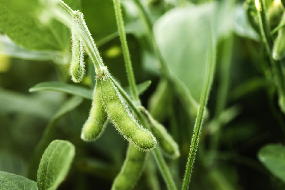 Diese binden den Luftstickstoff und überführen ihn in lösliche Stickstoffverbindungen, die die Sojabohne als Nährstoff nutzen kann. Die Stängel der Pflanze sind dünn, meist nur wenig verzweigt und stark behaart. Im unteren Teil stehen die langstieligen, ovalen, dreiteiligen Blätter gegenständig, weiter oben sind sie wechselständig angeordnet. Noch während der Fruchtreife werden sie abgeworfen. Die meist selbstbefruchtenden Blüten sind typische kleine weiße oder violette Schmetterlingsblüten, die in Blütentrauben zu drei bis 20 Stück stehen. Aus ihnen entwickeln sich zwei bis sechs cm lange grüne, borstig behaarte Hülsen, die ein bis sechs kugelige oder nierenförmige Samen enthalten.