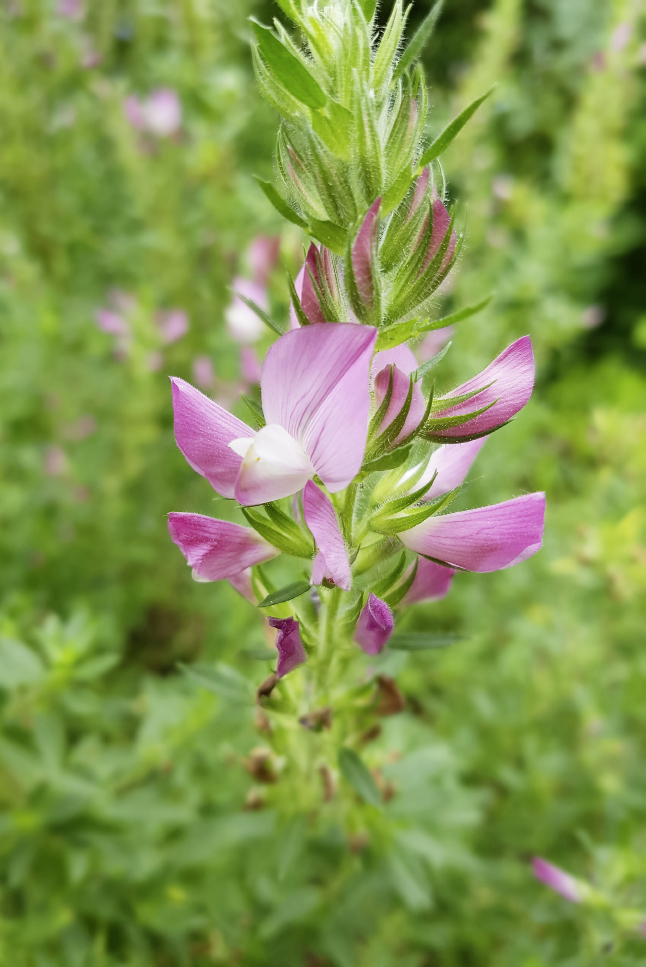 Harntreibende WurzelAuch die bei uns wachsende Hauhechel (Ononis spinosa) ist ein Hülsenfrüchtler mit einer Pfahlwurzel. Diese wird bis zu 50 cm lang und zwei cm dick. Außen ist sie graubraun, mit Längsfurchen versehen und oft spiralig verdreht. Innen zeigt sie einen charakteristischen strahligen Bau des Holzkörpers, der durch gleich breite Markstrahlen entsteht. Früher war die Hauhechel eine weit verbreitete Pflanze. Durch Düngung wurde sie weitgehend vertrieben. Man findet sie heute vor allem noch auf naturbelassenen Weiden, auf Brachen, an sonnigen Böschungen sowie an Wegrändern und entlang von Bahndämmen in Höhen bis 1500 Metern. Die Hauhechel ist ein 30 bis 60 cm hoher Halbstrauch mit langen, spitze Dornen an den Seitentrieben.